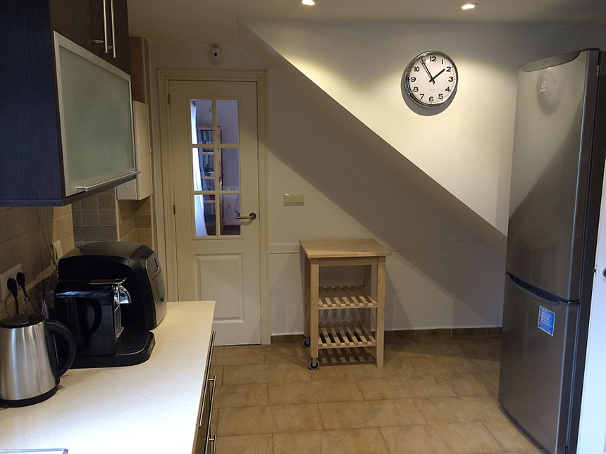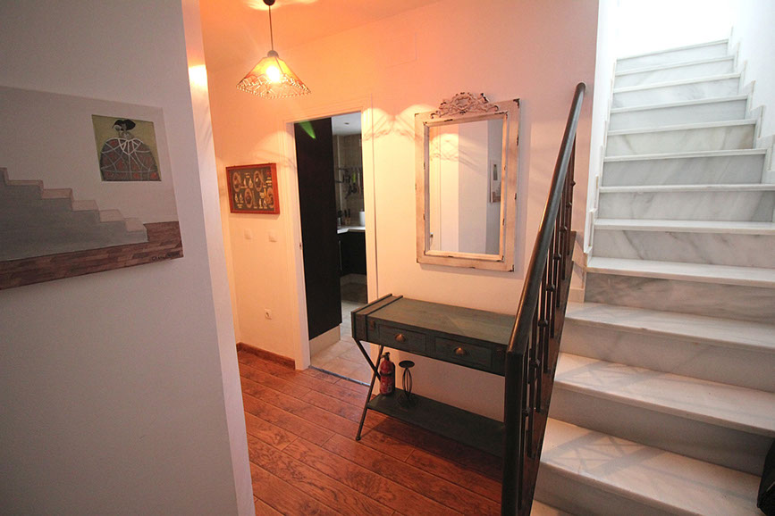 En la planta baja esta la entrada con pasillo, un aseo, el dormitorio principal con cama de matrimonio y baño en suite (bañera con ducha, lavabo doble de marmol, WC), la cocina con vitroceramica,horno, microonda, Nespresso, maquina de hielo, nevera con congelador y todo lo que se necesita para cocinar. Un cuarto con lavadora y trastero.