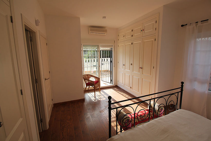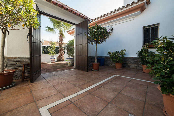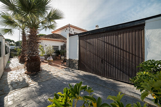 En la parte frontal tenemos una cochera enorme y la entranceto nuestra Golfvilla. Tome un vaso de vino en la noche en el patio andaluz y escuchar allí a la orquesta de las cigarras !