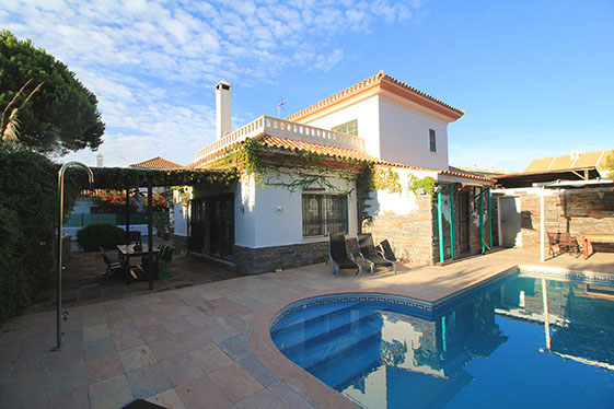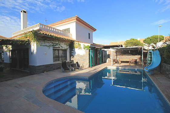Se admiten perros, incluso en la piscina privada con tobogán. La propiedad esta vallada completamente y situada en una zona tranquila al lado de hoyo 12 del campo de golf Nuevo Portil.