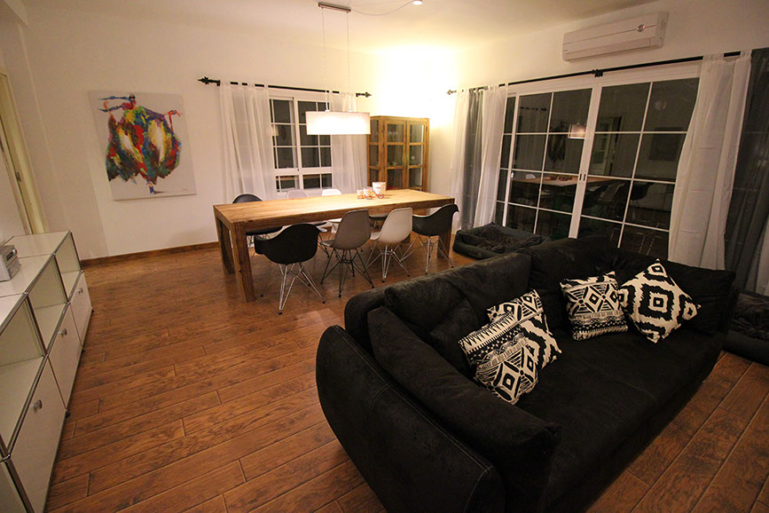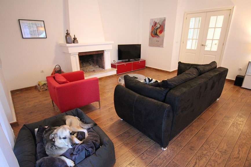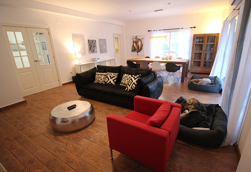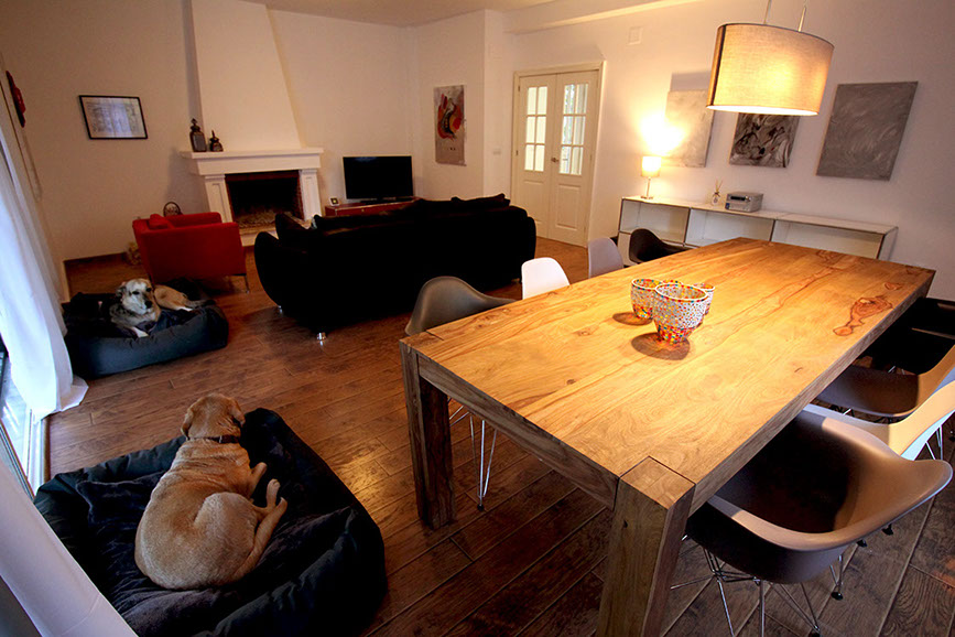 Salon comedor con salida a la terraza, en la casa hay siempre dos camitas para perros