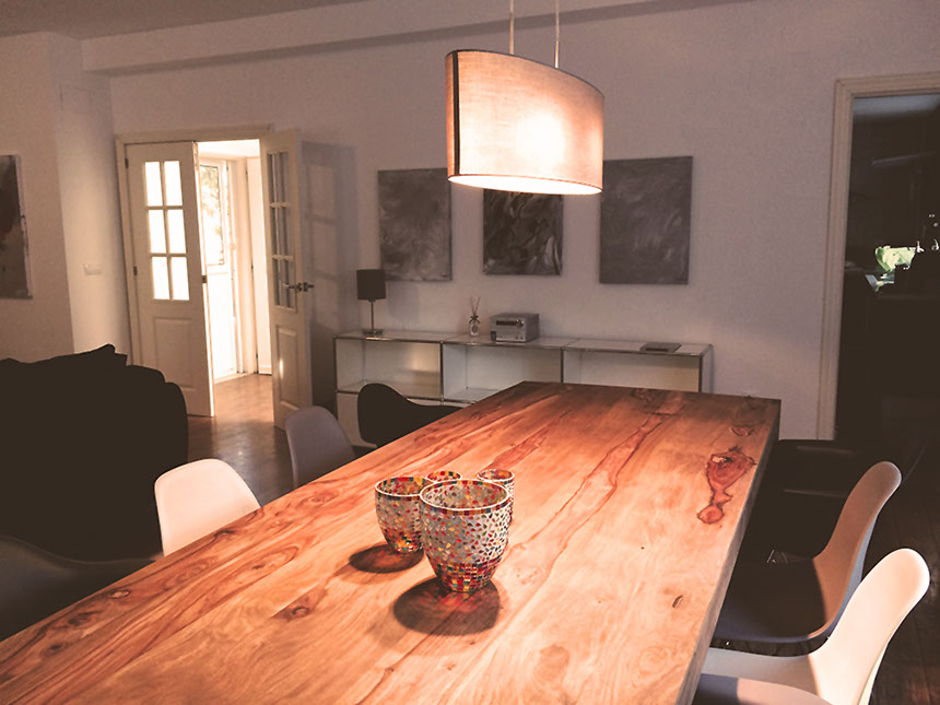 El salón amueblado con muebles de diseño de vitra, usm haller y living divani tiene una mesa grande de madera, sofa cama, chimenea, Sat TV.